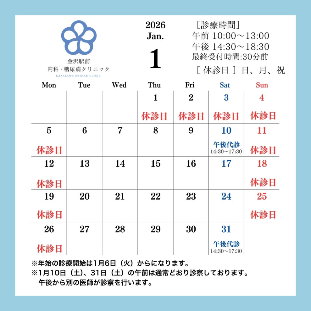 こんにちは! 金沢駅前内科・糖尿病クリニックです。
